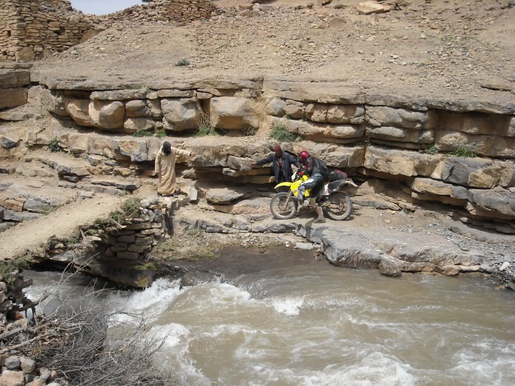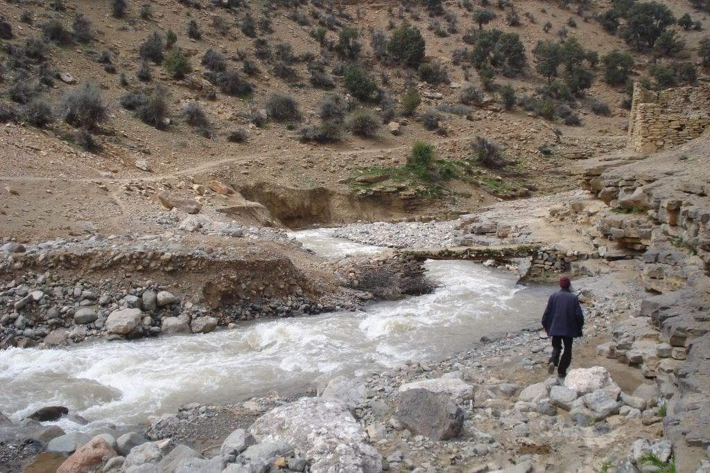 Overtaken a prolonged snow began falling along a canyon. When we reached the bottom of the gorge we came across the river caesarean, which is grown because of melting ice. Amarok threatens to cross a stretch but I do not see anything clearly. Then there are three Berbers and indicate that there is a walkway a few feet away.
